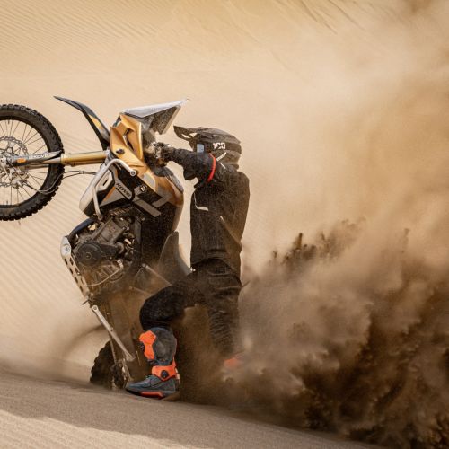 Das eigens entwickelte TAISKO-Bremssystem wurde unter härtesten Dakar-Bedingungen getestet und garantiert maximale Leistung auf schwierigstem Terrain. Der Großteil des Tankvolumens liegt unter dem Sitz – so bleibt die KOVE 800X-Rally auch vollgetankt perfekt ausbalanciert.